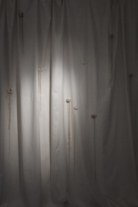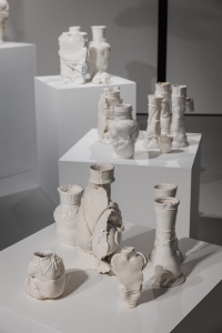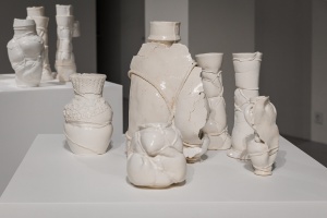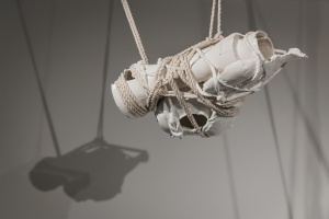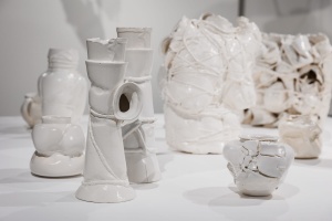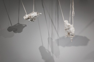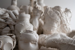 In the project ‘My body is a Cage’ Brochet uses the female body as a symbol, associating it with white porcelain and earthenware to reflect its beauty and fragility. In milky ceramic forms Brochet sees the same semi-matte, mesmerising surface that you might want to touch and stroke, but with extreme care. The process of transforming and acquiring a human aspect provided the basis for the exhibition. Moreover, as the forms become ‘humanised’, the ropes pull tighter. Traces of lace underwear on the surface of the vessels resemble imprints on living skin, serving as a reminder of physicality and intimacy, as well as the vulnerability of the human body.