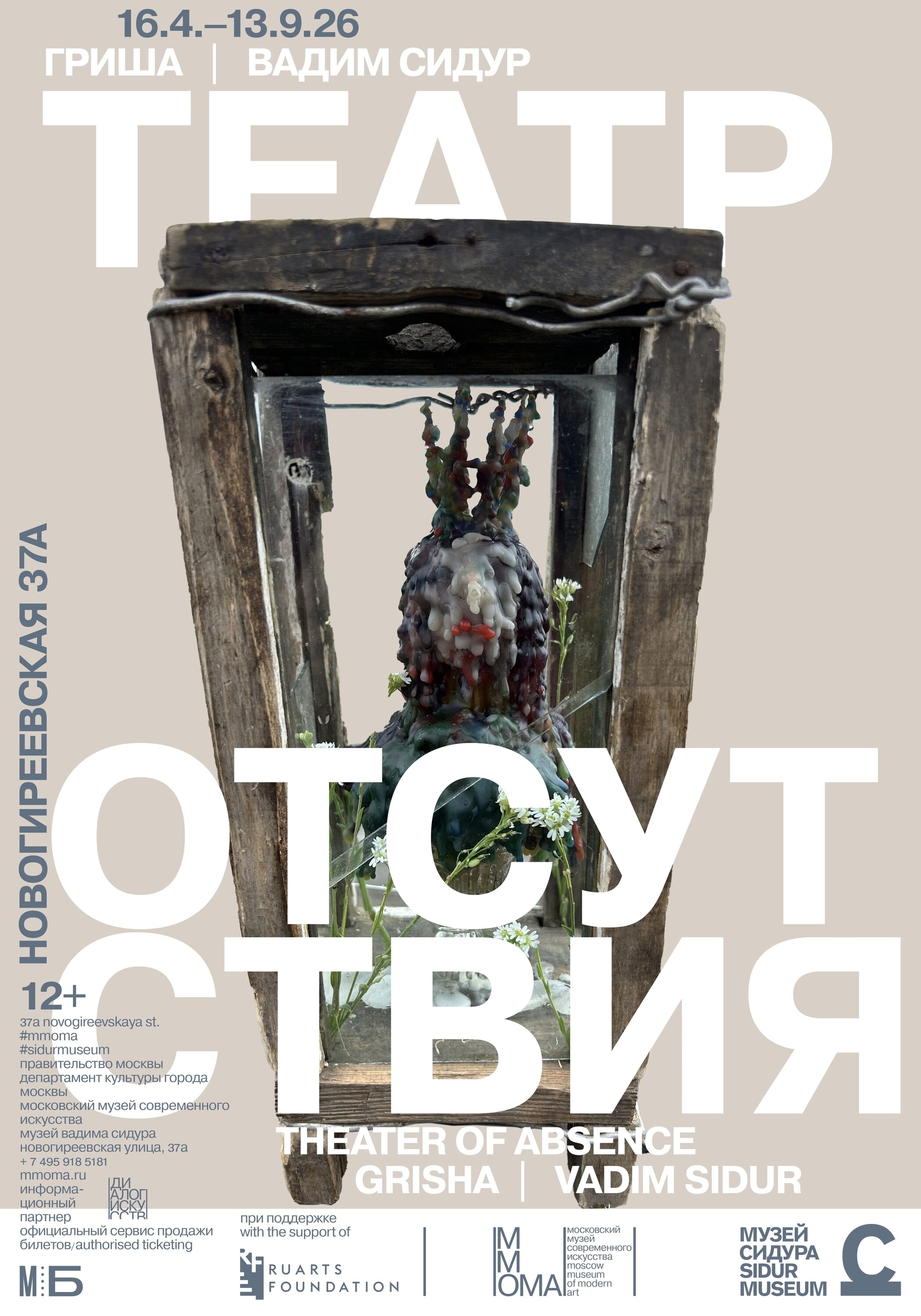 Музей Вадима Сидура и Московский музей современного искусства при поддержке Фонда содействия развитию современного искусства Ruarts представляют выставочный проект «Гриша | Вадим Сидур. Театр отсутствия». В экспозиции представлены созданные специально для проекта восковые скульптуры и графика современного художника Гриши, работы Вадима Сидура, а также произведения из коллекции Московского музея современного искусства.