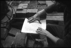 В основе концепции выставки лежит идея исторической памяти, хранящейся в артефактах современного городского пространства. 0331с как уличный художник видит в объектах урбанистической среды не только носителей определенных функций, но и хранителей истории места, свидетелей разных эпох. История проекта началась с мимолетных карандашных набросков портретов случайных жителей города, которые 0331с делал на протяжении нескольких лет. В попытке увековечить память о них художник обращается к предметам городской повседневности, которые хранят в себе следы человеческого присутствия, — камням брусчатки, найденным им в разных районах города. Трещины, потертости и сколы представляют собой свидетельства жизни многих поколений людей, чьи личные истории сегодня забыты. С помощью скарпеля и молотка художник высекает созданные им сиюминутные зарисовки в «вечном» материале габбро-диабазе. Молниеносное движение руки по бумаге блокнота превращается в многочасовое высекание все тех же линий в граните. Таким образом недолговечное искусство граффити обретает вневременной характер. Выложенные на полу в пространстве ММОМА на Гоголевском бульваре, 293 портрета на брусчатке формируют коллективный образ «немых» свидетелей истории и повседневное, по сути, незамеченное прохождение «по головам». Это иллюстрация комплекса сложных взаимоотношений между людьми, без сожаления стирающих из памяти чужие судьбы и истории, отголоски которых остаются в виде своеобразного архива образов. Желая напомнить о неизбежном забвении, 0331с обращается к технике литографии и создает собрание эстампов, отпечатков с каждого из камней. Выполненные на тончайшей рисовой бумаге, эстампажи взмывают под потолок Музея Сидура в попытке преодолеть конечность человеческой памяти. Истинное бессмертие и нетленность они обретают в гранитных шкатулках. Символическое погребение в вечности сопровождается музыкальным произведением «Марш тишины», созданным саунд-художниками Глебом Глонти и Михаилом Мясоедовым специально для выставки. 0331с фокусирует свое внимание на сложных переходах от временного к вечному, от сиюминутного к непрерывному. Хранителями индивидуальной памяти о людях и событиях становятся камни, найденные, в частности, вдоль шоссе Энтузиастов, на месте которого проходил Владимирский тракт — печально известный путь ссыльных на каторгу в Сибирь. Таким образом проект «ПО ГОЛОВАМ» продолжает одну из магистральных линий деятельности Музея Вадима Сидура по изучению локального контекста районов Перово и Новогиреево и сохранению исторической памяти места.